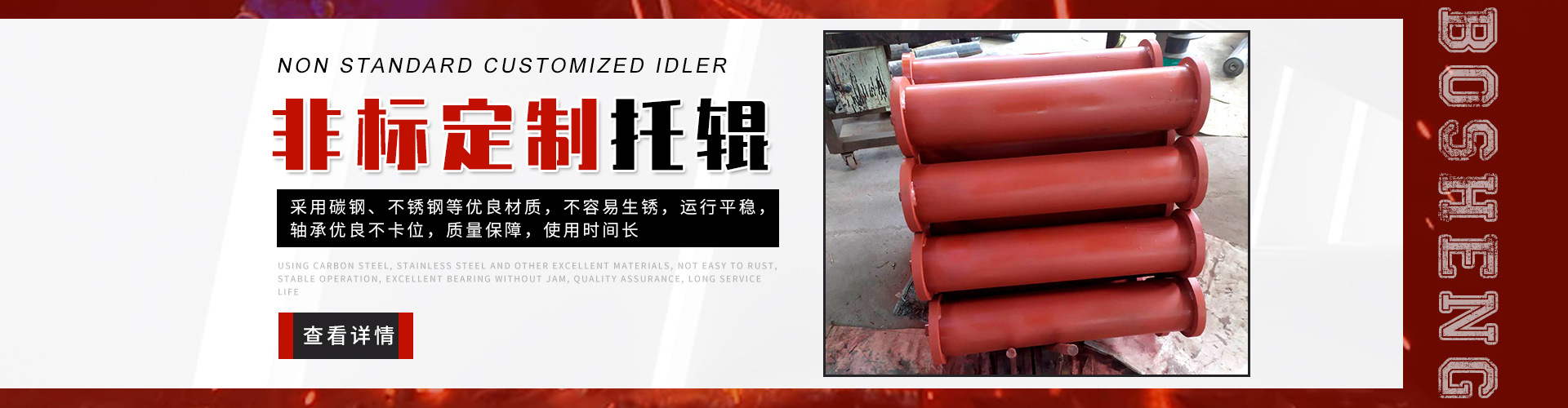 泰安博晟礦山機(jī)械有限公司位于山東泰安新泰市汶南鎮(zhèn)陳糧村。緊鄰京滬、京福、萊新高速公路。公路交通極為方便,環(huán)境優(yōu)美。公司主要生產(chǎn):托輥、托輥配件、托輥支架等皮帶輸送機(jī)配件。歡迎各界商友前來洽談考察。聯(lián)系電話:13954880316. 泰安博晟礦山機(jī)械有限公司采用國際標(biāo)準(zhǔn)設(shè)計、制造技術(shù),將托輥的設(shè)計和制造提高到了一個更高的水平,生產(chǎn)的托輥具有小的旋轉(zhuǎn)阻力,長的壽命,小的維修工作量和高的承載能力。鋼管采用托輥專用高頻焊管,管內(nèi)做去刺處理,圓度控制在特殊的公差范圍之內(nèi)。軸是按標(biāo)準(zhǔn)公差加工的冷拉鋼制造。軸承座采用進(jìn)口冷扎鋼板經(jīng)多次工藝沖壓而成。托輥管和軸承座被自動焊接機(jī)械手焊接在一起,形成一個具有很高強(qiáng)度的整體構(gòu)造。托輥軸承采用國內(nèi)外知名品牌的大游隙深溝球雙密封軸承,使托輥具有理想的靜平衡和動平衡,其旋轉(zhuǎn)阻力優(yōu)于國標(biāo)。托輥密封采用綜合國外和國內(nèi)迷宮式密封的特點(diǎn)進(jìn)行了專門設(shè)計,內(nèi)充耐高速高溫和超低溫抗氧化鋰基酯,有效防止雜質(zhì)、水、空氣對托輥內(nèi)部的侵蝕。 目前我們托輥系列產(chǎn)品有槽形上調(diào)心托輥組、槽形托輥、槽形下調(diào)心托輥組、承載托輥、緩沖托輥、回程托輥組、螺旋托輥、摩擦上調(diào)心托輥組、平行緩沖托輥組、平行上調(diào)心托輥、礦用托輥、煤礦專用托輥、梳型托輥、樹脂托輥、陶瓷托輥、橡膠托輥、錐形托輥、立輥等。規(guī)格:直徑50-219mm;長度190-2600mm。 泰安博晟礦山機(jī)械有限公司竭誠愿與廣大客戶合作,共同發(fā)展開發(fā)新技術(shù)新項目。泰安博晟礦山機(jī)械有限公司秉承